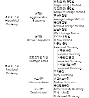 분할 방법에는 프로토타입 기반, 분포기반, 밀도기반, 그래프기반이 있다