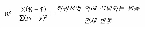 - 총변동중에서 회귀선에 의해 설명이 되는 변동이 차지하는 비율을 의미한다.